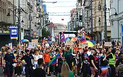 Una encuesta de Ipsos de junio de 2017 reveló que el 52% de los polacos estaban a favor de las uniones registradas y el 38% a favor del matrimonio entre personas del mismo sexo.[101] Según una encuesta del Pew Research Center realizada más tarde ese año, el 32% de los polacos apoyaba el matrimonio entre personas del mismo sexo (el 25% "algo" y el 8% "fuertemente"). En 2018 IBRiS ( Instytut Badań Rynkowych i Społecznych ) ) Una encuesta mostró que el 59% de los polacos apoyaba el reconocimiento de los matrimonios entre personas del mismo sexo válidos celebrados en el extranjero, mientras que el 30% se oponía. Una encuesta realizada por la misma organización de sondeos el año siguiente mostró que el 44% de los polacos apoyaba las uniones registradas, el 32% apoyaba el matrimonio entre personas del mismo sexo y el 12% apoyaba la adopción por parejas del mismo sexo.[88] El Eurobarómetro de 2019 reveló un gran aumento en el apoyo: el 45% de los polacos apoya el matrimonio entre personas del mismo sexo y el 50% se opone. Este aumento del 17% respecto a 2015 fue el segundo más alto de la Unión Europea, después del de Alemania, con un 18%. Entre los países que formaron el antiguo Bloque del Este (excluyendo Alemania Oriental), Polonia ocupó el segundo lugar en apoyo al matrimonio entre personas del mismo sexo, después de la República Checa.[102] Una encuesta de Ipsos de agosto de 2019 para OKO.press mostró cifras similares: 41% a favor del matrimonio entre personas del mismo sexo y 60% a favor de las uniones registradas,[103] al igual que una encuesta de Kantar Group realizada el mes siguiente: 42% a favor del matrimonio entre personas del mismo sexo y 57% a favor de las uniones.[104][105] Para 2022, el apoyo había aumentado al 64% para las parejas de hecho, al 48% para el matrimonio entre personas del mismo sexo y al 24% para el derecho a la adopción, según una encuesta de IBRiS para Radio ZET.[106]