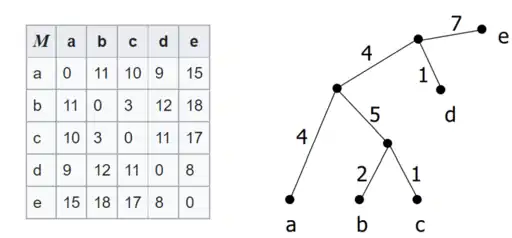 El siguiente es un ejemplo de una matriz de distancia ultramétrica con su correspondiente árbol.