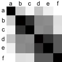 Estos datos pueden ser vistos de forma gráfica como un mapa de calor. En la siguiente imagen, el negro denota una distancia de 0, representando el blanco la distancia máxima: