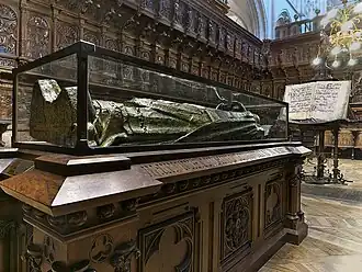 Muerto Don Mauricio en 1238,[12] fue sepultado en el coro de la catedral, que entonces estaba en el presbiterio. Su cenotafio, ricamente esmaltado, pudo ser sufragado por Blanca de Castilla, dadas las relaciones del prelado con París y la corte francesa.[13] En el siglo XVI el sepulcro se trasladó al coro nuevo, situado en la nave central del templo.