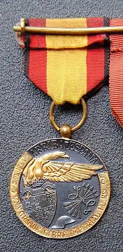 La Orden de 17 de octubre de 1937 (BOE número 362) estableció la celebración de un concurso para la selección del diseño de la insignia de esta medalla, concurso que se declaró desierto en la Orden de 27 de noviembre de 1937. En la Orden Circular de 26 de marzo de 1938 (BOE número 522) aprobó la realización de un concurso para adquirir las insignias para esta medalla, cuyo diseño y modelo de la cinta y pasador ya habían sido establecidos, llegando a reunirse 50 000. De estas insignias, 48 000 se destinaron a recompensar méritos de vanguardia y 2000 servicios en la retaguardia.