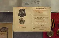 Cada medalla venía con un certificado de premio, este certificado se presentaba en forma de un pequeño folleto de cartón de 8 cm por 11 cm con el nombre del premio, los datos del destinatario y un sello oficial y una firma en el interior.[1] Por el decreto del 5 de febrero de 1951 del Presídium del Sóviet Supremo de la URSS, se estableció que la medalla y su certificado quedarían en manos de la familia tras la muerte del beneficiario .[6]