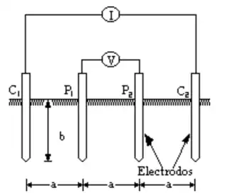 La medición consta de insertar 4 electrodos en línea recta, a igual distancia cada uno y a igual profundidad del suelo. Las mediciones de resistividad no dependerán del material de los electrodos, en cambio sí dependerán del contacto que hagan con la tierra, de la distancia entre estos y de la resistividad propia del terreno. Al inyectarse una corriente directa o de baja frecuencia entre los electrodos C1 y C2 mientras que la diferencia de potencial se mide entre los electrodos P1 y P2. La relación entre la corriente y la tensión nos dará la resistencia del suelo. La resistividad resultante será una función de dicha resistencia y la geometría del electrodo. Si la distancia enterrada es pequeña en comparación a la distancia entre electrodos, entonces la resistividad puede aproximarse por