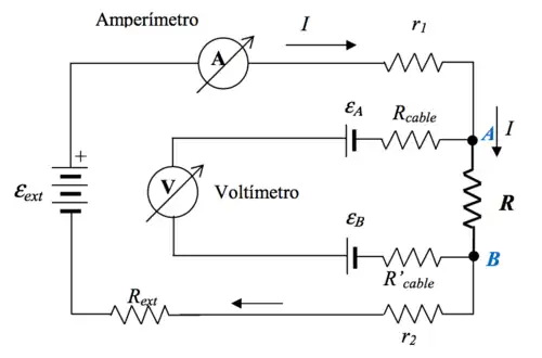 De esta manera, el método de medición a cuatro puntas permite medir resistencias pequeñas, ya que elimina la contribución de la resistencia de cableado en la medición y de los potenciales de contacto. Además, es conveniente utilizar una fuente que regule la corriente de alimentación del circuito, manteniendo una dada tensión entre sus extremos, y fijando un límite para la corriente alimentada Esto permitirá limitar la potencia disipada por el circuito a los límites permitidos por los instrumentos y elementos mediante la corriente máxima de alimentación y , y al mismo tiempo trabajar con una tensión constante sobre el circuito.[2]