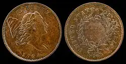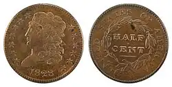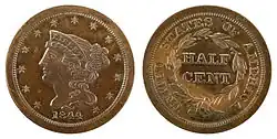 El medio centavo, o half cent, fue la denominación más pequeña de la moneda estadounidense. Se acuñó por primera vez en 1793 y cesó su emisión en 1857. Fue acuñado con cinco diseños diferentes.