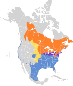 Su área de distribución comprende desde el centro de Canadá hasta Terranova, y el este de los Estados Unidos. En invierno migra a la costa del Golfo de México, en el sureste de Estados Unidos. Hay también algunos registros accidentales en invierno en Turcas y Caicos, Bahamas y el norte de México.