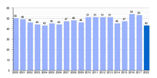 Gráfica de evolución demográfica de Mendíjur[13] entre 2000 y 2022