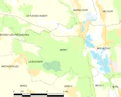 Merey es una población y comuna francesa, en la región de Alta Normandía, departamento de Eure, en el distrito de Évreux y cantón de Pacy-sur-Eure.