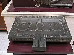 - De Amenemhat II,[1] ornamentado en el centro con el signo Sema-Tauy, símbolo de las Dos Tierras; sus cuatro lados llevan fórmulas de ofrenda a los dioses Osiris y Anubis, grabados con los nombres de Sa-Ra y Nesut-Bity de Amenemhat II;