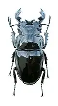 Es el escarabajo ciervo más grande de África con 90 mm de largo. Son además bastante robustos y pesados, en comparación con otros miembros de su familia. La forma curvada de las mandíbulas le da mayor fuerza y resistencia. Su característica principal es su color negro intenso y brillante, característica también presente en la zona ventral y en las hembras. Puede emitir sonidos frotando la cabeza y el tórax, usualmente cuando se encuentran enojados.