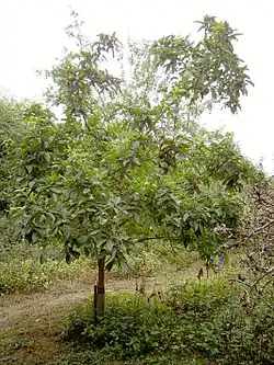 Árbol de hasta 5 m de altura, aunque también puede crecer con porte arbustivo, caducifolio. Posee una copa baja y extendida con ramas retorcidas. Las hojas son oblongo-lanceoladas (12 cm × 5 cm), puntiagudas con márgenes dentados o lisos; con envés pubescente y haz glabro verde brillante. Con una vida útil de treinta a sesenta años, el árbol es bastante efímero.[6]