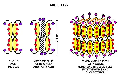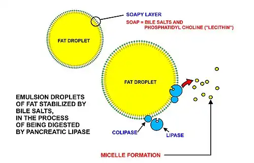 Estos triglicéridos, no pueden ser absorbidos por el intestino.[16][17] Sino que son degradados a mono y diglicéridos más ácidos grasos líbres (aunque no glicerol libre) por la lipasa pancreática, la cual forma un complejo 1:1 con una proteína llamada colipasa (también constituyente del jugo pancreático), la cual es necesaria para su actividad. El complejo activado funciona únicamente en la interfaz agua-grasa. Por lo que es esencial que las grasas, primero se encuentren emulsificadas por las sales biliares para la actividad óptima de estas enzimas.[18] Los productos de la digestión consisten en una mezcla de tri, di y monoglicéridos más ácidos grasos libres, los cuales junto con otros contenidos liposolubles de la dieta (por ejemplo vitaminas liposolubles y colesterol) y las sales biliares forman micelas mezcladas, en el contenido acuoso duodenal (ver el diagrama a la izquierda).[19][17]