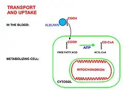 - Los ácidos grasos de cadena larga entran a las células que van a metabolizarlos (la mayor parte de las células del organismo excepto glóbulos rojos y neuronas del sistema nervioso central) a través de proteínas transportadoras específicas, tales como la familia de proteínas transportadoras de ácidos grasos SLC27.[5][6] Los glóbulos rojos no contienen mitocondrias, y por lo tanto no pueden metabolizar ácidos grasos, los tejidos del sistema nervioso central no pueden hacer uso de los ácidos grasos, a pesar de que contienen mitocondrias, porque los ácidos grasos no pueden cruzar la barrera hematoencefálica hacia el fluido intersticial que baña a estas células.