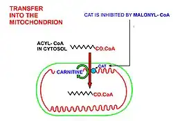 - Para que el acil-CoA pueda entrar a la mitocondria debe hacer uso de la lanzadera de carnitina:[7][8][9]