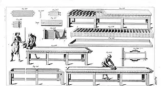 Después de enfriarla, la placa se corta limpiamente y luego se cepilla. En el pasado, se ajustaba al espesor deseado utilizando cepillos manuales, aunque actualmente este proceso se realiza con una cepilladora mecánica especial.[5] Para ello, la placa metálica se sujeta al tambor de la máquina, imprimiéndole un movimiento de rotación para que una pieza de acero, que se fija transversalmente al tambor, corte gradualmente el material sobrante, de forma similar a como funciona un torno de mecanizado. Este método permite darle a la plancha un espesor muy preciso.