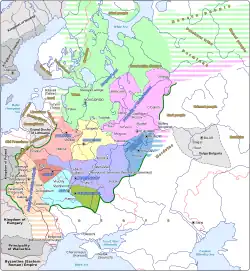 Tras escapar del embate de las invasiones mongolas, el Gran Ducado de Lituania se expandió a las zonas vecinas, debilitadas por los conflictos internos y las depredaciones mongolas. Si bien estas expansiones solían realizarse a expensas de los principados eslavos de la antigua Rus de Kiev, en ocasiones eran voluntarias. Por ejemplo, los duques del Principado de Túrov comenzaron a cooperar cada vez más con el Gran Ducado y, a principios del siglo XIV el principado se unió a él de forma pacífica. En 1320 la mayoría de los principados de la Rus occidental fueron vasallos o directamente anexionados por Lituania. En 1321, Gediminas capturó Kiev y envió al exilio a Stanislav, el último ruríkida en gobernarla. Gediminas también restableció la capital permanente del Gran Ducado en Vilna,[4] presumiblemente trasladándola desde la antigua Trakai en 1323.[5] El estado continuó expandiendo su territorio bajo el reinado del gran duque Algirdas y su hermano Kęstutis, quienes gobernaron el estado en armonía.[6][7]