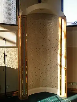 El ángulo que se genera en la intersección de las calles, es paralelo al que se genera con los muros de la mezquita, a los cuales se les llama la qibla, este se encuentra en el lugar más visible del salón. En el centro de la qibla se ubica el mihrab decorado con mosaicos. Este pequeño ábside indica la dirección a la Meca, es decir, la orientación donde los fieles deben efectuar su oración. A su lado se ubica el Mimbar, donde el imán se dispone a dirigir la oración.
