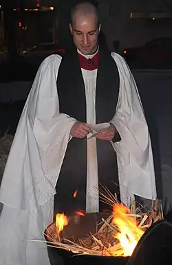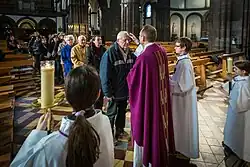 ![]() Rito de imposición de la ceniza, parte integral de la celebración litúrgica del Miércoles de Ceniza con que se inicia la Cuaresma en el rito romano. Se observa al celebrante con vestimenta de color morado, típica de este tiempo litúrgico, que simboliza la actitud penitencial. | |||||