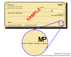 Los cheques bancarios, así como varios otros artículos de valor, también pueden aprovechar los métodos de microimpresión, pero generalmente no son de un tamaño tan extremo. Por ejemplo, los cheques bancarios personales suelen colocar los caracteres MP junto a la línea de firma del cheque; estos caracteres representan microimpresiones e indican que la línea de firma u otras características de verificación son en realidad caracteres microimpresos. Los caracteres microimpresos se utilizan como una característica contra la falsificación debido a su dificultad para reproducirse, mientras que el MP prominente sirve como una advertencia disuasoria abierta de que el artículo emplea microimpresión.