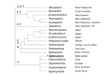 - ↑ Kristensen, N.P. (1999). The non-Glossatan Moths. Ch. 4, pp. 41-49 in Kristensen, N.P. (Ed.). Lepidoptera, Moths and Butterflies. Volume 1: Evolution, Systematics, and Biogeography. Handbuch der Zoologie. Eine Naturgeschichte der Stämme des Tierreiches / Handbook of Zoology. A Natural History of the phyla of the Animal Kingdom. Band / Volume IV Arthropoda: Insecta Teilband / Part 35: 491 pp. Walter de Gruyter, Berlin, New York.