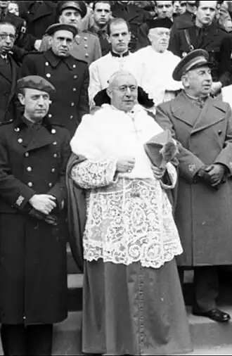 ![]() Díaz Gómara (centro) durante un acto de exaltación a José Antonio Primo de Rivera en 1939 en la catedral de Barcelona. A su izquierda el capitán general de Cataluña, Luis Orgaz | ||