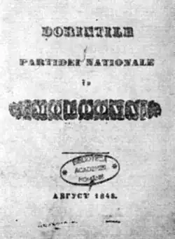 Kogălniceanu llegó a ser miembro y principal ideólogo del Comité Central Revolucionario de Moldavia, durante su exilio.[33] Su manifiesto, "Dorinţele partidei naţionale din Moldova" (agosto de 1848), era, efectivamente, un proyecto constitucional, que listaba los propósitos de los revolucionarios rumanos.[36] Contrastaba con las primeras peticiones que los revolucionarios habían presentado a Sturdza, que pedían una adhesión estricta al "Regulamentul Organic" y el fin de los abusos.[37] En sus 10 secciones y 120 artículos,[7] el manifiesto pedía, entre otras cosas, autonomía interna, derechos civiles y políticos, separación de los poderes, abolición de los privilegios, y el fin de los "corvées", así como la unión de Valaquia y Moldavia.[33] Refiriéndose al último ideal, Kogălniceanu afirmó que constituía: