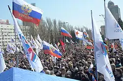 El 3 de marzo de 2014, durante los disturbios prorrusos de 2014 en Ucrania, grupos de manifestantes tomaron el control del edificio de la administración regional en Donetsk.[18] En él participó un grupo armado de oposición recién creado, denominado Milicia del Pueblo del Dombás, dirigido por Pável Gubárev.[18] Esto sucedió cuando 11 ciudades ucranianas con poblaciones significativas de personas de etnia rusa estallaron en manifestaciones contra el nuevo gobierno ucraniano.[18] El 6 de abril de 2014, 2000 manifestantes prorrusos se manifestaron frente al edificio de la administración regional.[19] El mismo día, grupos de manifestantes en el este de Ucrania asaltaron el edificio de la administración regional en Járkov y la sede de la SBU en Lugansk.[5] Los grupos crearon un consejo popular y exigieron un referéndum como en Crimea.[19][20][21][22][23][24][25][26] A los pocos días, varios edificios gubernamentales en ciudades como Kramatorsk y Sloviansk también fueron asaltados. El 12 de abril, los partidarios de la República Popular de Donetsk y miembros de la Milicia Popular de Dombás instalaron puestos de control y barricadas en Sloviansk. El mismo día, exmiembros de la unidad "Berkut" de Donetsk se unieron a las filas de la Milicia Popular del Dombás.[27][28][29][30][31][32][33]