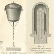 Se activa cuando un barco golpea una tapa que sobresale del casco de la mina, que contiene una ampolleta de vidrio con electrolito de una celda galvánica. Las primeras minas tenían mecanismos mecánicos para detonarlos, pero estos fueron reemplazados en la década de 1870 por el "cuerno Hertz" (o "cuerno químico"), que funcionaba de manera fiable incluso después de que la mina hubiera estado en el mar durante varios años. La mitad superior de la mina está salpicada de protuberancias de plomo huecas, cada una de las cuales contiene una ampolleta de vidrio llena de ácido sulfúrico. Cuando el casco de un barco aplasta el cuerno de metal, rompe la ampolleta dentro de él, permitiendo que el ácido corra por un tubo al interior de una batería de plomo-ácido que hasta ese momento no contenía electrolito ácido. Esto de energía a la batería, que detona la carga explosiva.[46] Las formas anteriores del detonador empleaban una ampolleta de vidrio llena con ácido sulfúrico, rodeada por una mezcla de perclorato de potasio y azúcar. Cuando se quebraba la ampolleta, el ácido encendía la mezcla de perclorato y azúcar, y la llama resultante encendía la carga de pólvora.[47]