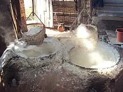 Alrededor del año 500 a. C., los antiguos chinos excavaron cientos de pozos de salmuera, algunos de los cuales tenían más de 100 metros (330 pies) de profundidad. Se perforaban grandes depósitos de salmuera debajo de la superficie de la tierra mediante la perforación de pozos.[3] Se erigían torres de bambú, de estilo similar a las torres de perforación de petróleo de hoy en día.[4] El bambú se utilizaba para cuerdas, revestimientos y cabrias, ya que era resistente a la sal.[5] Se colgaban cuñas de hierro de una herramienta de cable de bambú unida a una palanca en una plataforma construida sobre la torre. Las torres de perforación requerían que dos o tres hombres subieran y bajaran de la palanca que movía la cuña de hierro clavada en el suelo para cavar un agujero lo suficientemente profundo en el suelo para golpear la salmuera.[5][4]