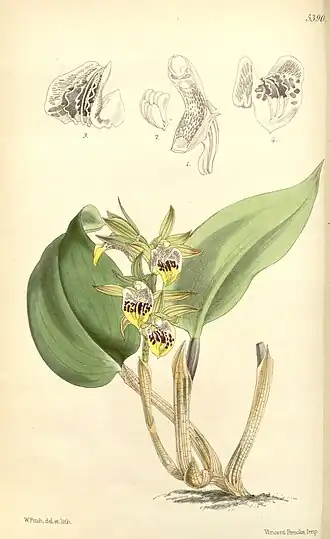El nombre del género se refiere a que el pseudobulbo se extiende hasta el tallo.