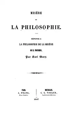 La miseria de la filosofía (también conocido: Miseria de la filosofía: Respuesta a Filosofía de la miseria del señor Proudhon; del original francés: Misère de la philosophie. Réponse à la philosophie de la misère de M. Proudhon) es un polémico libro de Karl Marx publicado en París y Bruselas en 1847, donde vivió en el exilio desde 1843 hasta 1849. Fue escrito originalmente en francés como una crítica de los argumentos económicos y filosóficos expuestos por el anarquista francés Pierre-Joseph Proudhon en su libro Sistema de las contradicciones económicas o Filosofía de la miseria.[1][2] Aunque en su título aparece la palabra "filosofía", esencialmente un libro es que trata el tema de la crítica de la economía política. En él, Marx critica el análisis económico de Proudhon como idealista al considerar los conceptos o categorías económicas como "leyes eternas" en lugar de ser producto de las relaciones de producción. Según Marx, hay que salir de la filosofía para analizar el mundo en la nueva perspectiva de la economía política, basada en el deseo de cambiar la sociedad. La filosofía debe ser el arma intelectual del proletariado.