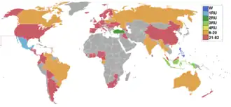 | Retirados | Belice, Bosnia y Herzegovina, Cuba, Escocia, Eslovenia, Israel, Lituania, Macedonia, Namibia, Montenegro, Vietnam | |