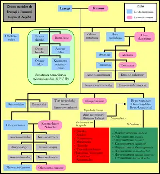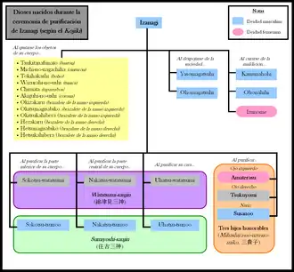 Según el Kojiki, de la relación de Izanagi e Izanami nacieron diversos dioses, hasta que la deidad del fuego Kagutsuchi al momento de nacer le quemó los genitales a Izanami y la hirió de muerte. Izanagi, al ver morir a su amada esposa y preso de la rabia, tomó una espada de diez palmos y asesinó a Kagutsuchi despedazándolo. Posteriormente, Izanagi fue al país de Yomi (el mundo de los muertos) a buscar a Izanami; no obstante cuando la encontró se había convertido en un cadáver putrefacto y de sus partes surgieron otros dioses, provocando la huida de Izanagi al mundo de los vivos. Luego, Izanagi procedió a realizar el misogi (ceremonia sintoísta de purificación) y al hacerlo nacieron otra cantidad variada de dioses. En este último nacieron los tres dioses más importantes del sintoísmo: Amaterasu, diosa del sol; Tsukuyomi, deidad de la luna; y Susanoo, dios del mar; y les encargó a éstos el control del mundo.