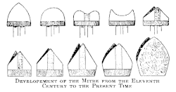 Las antiguas representaciones gráficas de mitras y los ejemplares auténticos que se conservan de esta prenda desde el siglo XIII nos dan a conocer las sucesivas evoluciones de la misma que se produjeron de la siguiente forma: