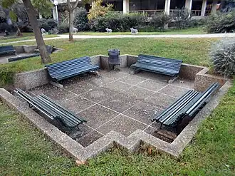 - Áreas recreativas: pueden ser de juegos infantiles, instalaciones deportivas (fútbol, baloncesto, voleibol, aparatos de gimnasia), zonas de pícnic, mesas de ping-pong, pistas de petanca y de skateboarding.[35]