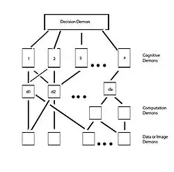 | 3 | Demonios cognitivos | Observa el “grito” de los demonios característicos. Cada uno de los demonios cognitivos es responsable de un patrón en específico (ej. La letra a del alfabeto). El “grito” de los demonios cognitivos está basado en que tanto del patrón fue detectado por los demonios característicos. Por más características que los demonios cognitivos encuentren que correspondan al patrón, más fuerte será el “grito”. Por ejemplo, si los demonios características están gritando con una línea con curva,otra línea larga y derecha, y finalmente otra pequeña con un un ángulo entonces el demonio cognitivo de la letra R estará emocionado, a su vez que el de la letra P estará un poco emocionado; pero el demonio cognitivo de la letra Z estará muy probablemente callado. |