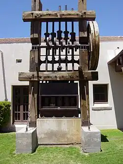 El molino consta de un conjunto de pisones de acero que se sostienen en un marco, y que se desplazan en un movimiento cíclico de subida y bajada. El sistema levanta los pisones mediante levas conectadas a un árbol de levas rotatorio en posición horizontal. Así cuando una leva desciende, el pisón también cae aplastando el mineral, luego el pisón es elevado en el siguiente ciclo.