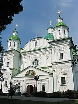 El katholikón barroco ucraniano fue erigido en la década de 1680 con la ayuda de una donación de los hetmanes Iván Samoylovych e Iván Mazepa. Un arquitecto alemán, que trabajó en el monasterio de la Trinidad de Chernígov, se encargó de la iglesia de siete cúpulas con seis pilares. El número de cúpulas se redujo a cinco después de que la central se derrumbara en 1728. El campanario neoclásico se comenzó a construir en 1785, pero las obras no terminaron hasta sesenta años después.[3]