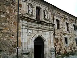 Presenta fachada con portada de dos cuerpos: el inferior acoge arco escarzano elevado con la clave sobresalida entre pilastras; el superior se articula con una ventana flanqueadas por dos hornacinas aveneradas que cobijan modernas estatuas de San Benito y San Bernardo.