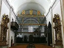 El espacio consiste en una única nave de seis tramos con un pequeño crucero y, en la cabecera, presbiterio rectangular. Una artística reja de hierro forjado de tres cuerpos y rematada con una crestería policromada y blasonada, de finales del siglo XVII, divide la nave para el culto: los cuatro primeros tramos se reservan al Coro monástico de clausura, y los dos posteriores junto con el crucero constituyen el espacio para la feligresía parroquial.