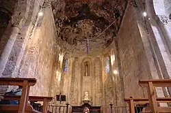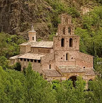 El edificio es el construido durante el siglo XII, tiene planta basilical de tres naves, sin transepto y con tres ábsides semicirculares, los laterales abiertos en la nave y el central, mucho más amplio; le precede un presbisterio en un nivel más bajo que la nave.