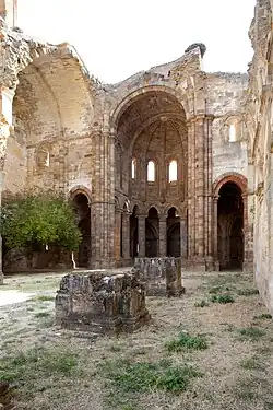 Las naves de la iglesia se derribaron en algún instante entre la exclaustración y la última década del siglo XIX. Se puede intuir que eran tres, la central más alta que las laterales. Solo ha sobrevivido dos de los muros laterales, muy modificados, y los basamentos de los pilares. El muro norte se conserva hasta media altura, se abren en él tres puertas: la puerta de conversos, la de monjes (ambas proporcionaban acceso al claustro) y una tercera de reducidas dimensiones. El muro sur se conserva con su altura íntegra, pero con abundantes grietas. La iglesia sufrió una fuerte transformación interior en el siglo XVI y XVIII. Las excavaciones arqueológicas realizadas en 1985 en el suelo junto a las basamentas de las columnas muestran que en la iglesia se hacían enterramientos en época de Carlos III.