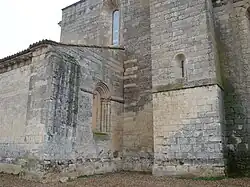 En el segundo tramo que limita con la nave sur se abre un gran vano de arco apuntado interrumpido por una columna, que correspondería a un arcosolio funerario. La arquivolta se apoya en unas pequeñas columnas cuyos capiteles están decorados con temas propios de un enterramiento: cabezas que se mesan los cabellos.[24] Según noticia del viajero e historiador Antonio Ponz que escribió a finales del siglo XVIII, allí había un sepulcro gótico con la figura de una mujer acostada.[25] En el tramo del muro norte es donde se halla la inscripción de consagración.[26] Se conservan todavía fragmentos del pavimento que tuvo en el siglo XVI, de buena cerámica. En este mismo suelo pueden verse algunas lápidas que corresponden a los abades muertos en el monasterio.
