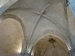 El crucero resulta una nave amplia, cubierta con bóveda de crucería, obra de principios del siglo XIII. En 1778 se abrió una puerta en la parte sur que conducía a la sacristía. Su arco es de medio punto con frontón partido y una cruz central. Las dos naves laterales inconclusas presentan dos únicos tramos. La nave central fue acrecentada en un tramo más en el siglo XV. Este trecho se utilizó como coro y capilla funeraria y está elevado con respecto al resto con una escalera de piedra en forma circular. Como en la nave del crucero, estas naves se cubren con bóvedas de crucería. A finales del siglo XVII estas bóvedas estuvieron pintadas al fresco quedando un vestigio en el ábside central.