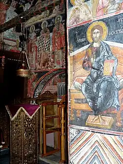 El plano de la iglesia tiene forma de tipo cruciforme y tiene una cúpula apoyada en dos columnas. La catedral principal del monasterio fue construida en el siglo XV y está decorada con frescos en 1741 realizada por dos monjes. Tiene columnas y arcos blancos, así como azulejos de color rosa. Su amplio nártex fue construido en 1689 y embellecido en 1692. La pequeña capilla de San Juan Bautista, tallado en la roca, contiene frescos del siglo XVII. En el pasado, esta estaba ricamente decorada y contenía manuscritos preciosos; sin embargo, estos tesoros fueron saqueados durante la Segunda Guerra Mundial, cuando Grecia fue ocupada por los alemanes. Se dice que los frescos del siglo XVI del edificio son pinturas postbizantinas. Un fresco con el esqueleto de Alejandro Magno adorna las paredes.