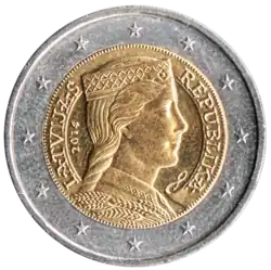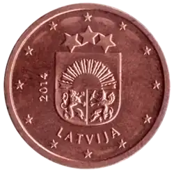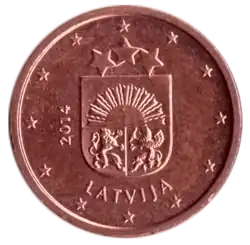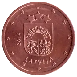 El 1 de enero de 2014, Letonia se convirtió en el decimoctavo país de la Unión Europea en adoptar el euro como moneda oficial, sustituyendo al lats letón.[6] El 9 de julio de 2013, se había establecido la tasa de cambio irrevocable en 0,702804 lats letones = 1 euro.[7]