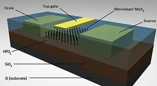 En 2011, se hizo el primer campo-transistor de efecto (FET), utilizando monocapas de MoS2 y mostrando un ratio encendido/apagado que superó el 108.[8]