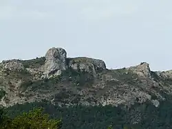 - Mola d'Estat (1120 m).[15] Es un tozal o muela en la vertiente norte del valle del río Brugent, a unos 300 m al sur de la Mola dels Quatre Termes, de 1118 m, donde se reunían los alcaldes para decidir la corta de pinos, cerca del camino viejo de Prades, que pasa al norte, a 1073 m de altitud. En la cima hay tres cruces de hierro. Al oeste, muy cerca, se halla la Cova Fumada, y al sudeste se encuentran los Roquedos de la Cansalada, que bordean los 1000 m. Desde aquí desciende el barranco del Tossal Gros, que va a desembocar en el río Brugent a la altura del Mas d'en Toni, a 650 m, donde el río gira hacia el este.