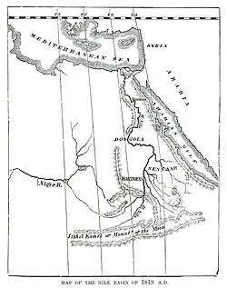 - ↑ "in two semi-circles like a new moon ... and seem, by their shape, to deserve the name of mountains of the moon, such as was given by antiquity to mountains in the neighborhood of which the Nile was supposed to rise." James Bruce, Travels to Discover the Source of the Nile (1805 edition), vol. 5 p. 209.