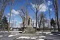 El monumento exhibe a un hombre abrazando a una mujer y a un niño. En el pie del monumento se muestra la inscripción: Guerra nunca más (polaco: NIGDY WOJNY).